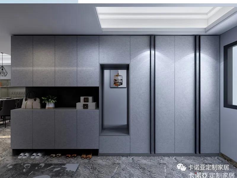 進(jìn)門是常見的長玄關(guān),靠墻設(shè)計一組玄關(guān)柜,柜子靠客餐廳一側(cè)做三段式鞋柜,減少空間的單一封閉感,視覺上更美觀。柜子的底端懸空,留出位置方便收納拖鞋和常用鞋,既美觀又實用。