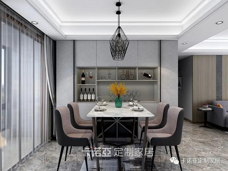 灰色系和粉色兩種撞色,柔和的燈光讓用餐環(huán)境更有格調(diào)。簡潔的餐桌搭配灰色餐邊柜,高低錯落,凹凸有致,讓餐廳更顯靈動。