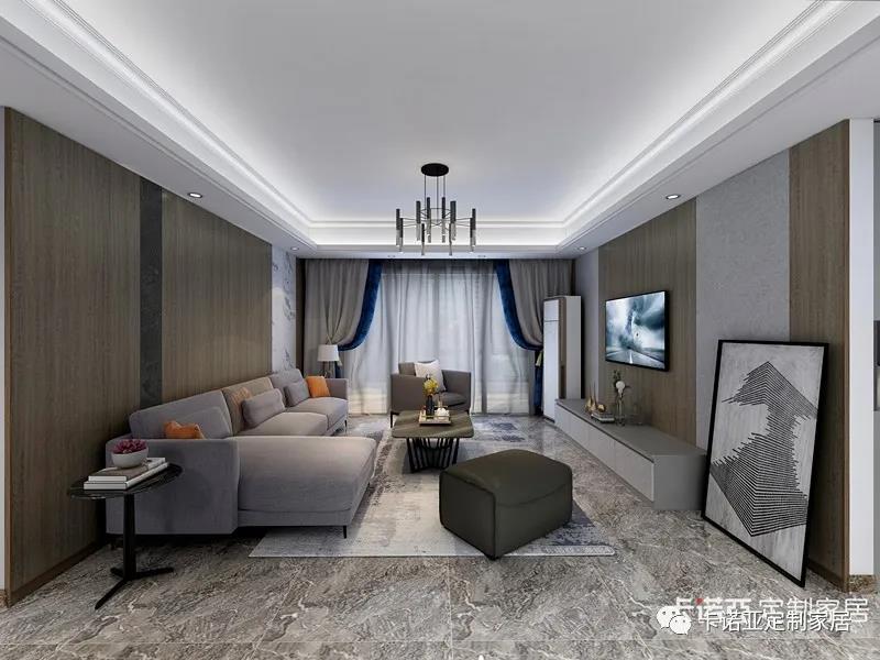 卡諾亞木光之城搭配黑金剛、漢白玉及灰姑娘組成的護(hù)墻板,在客廳里占據(jù)極其顯眼的位置,改變白墻的單一視覺?;疑蛔中碗娨暟?,與墻面遙相呼應(yīng)。