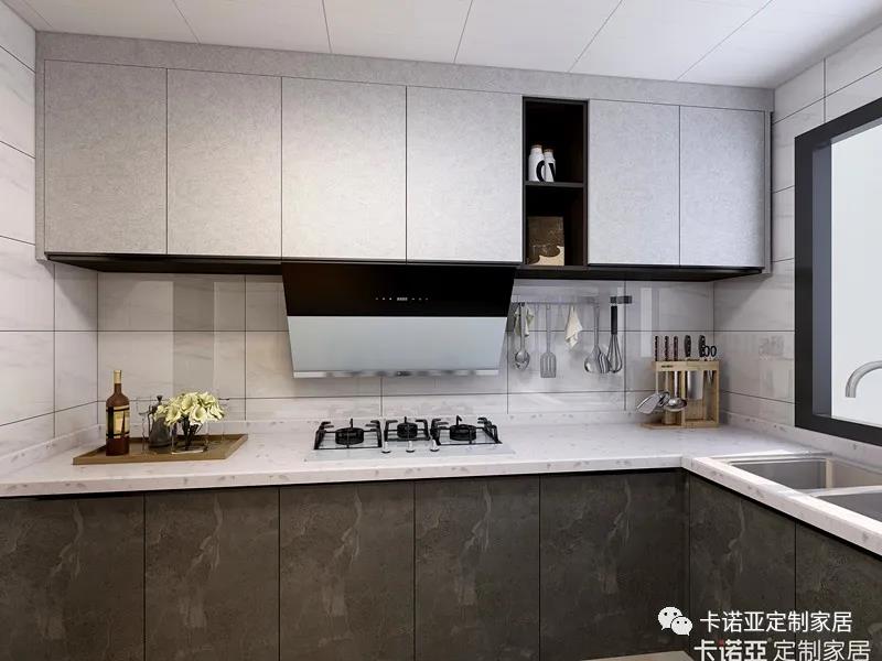 廚柜色彩采用撞色設(shè)計,吊柜采用淺灰的灰姑娘,地柜則是深灰的黑金剛,上淺下深,避免頭重腳輕,整體視覺簡約大氣。