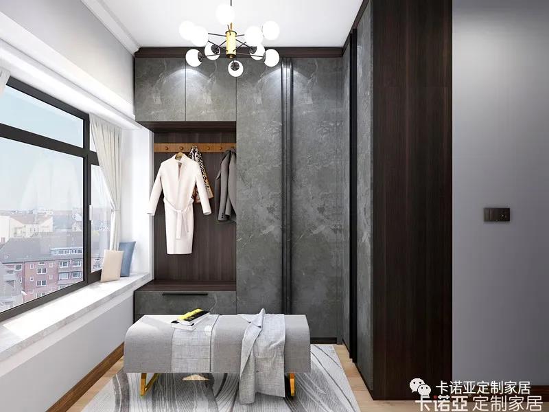 高級灰地柜+吊柜,柜體有藏有露,長條形玄關(guān)極致利用,收納性很強(qiáng)。為了方便出門整理儀容著裝,設(shè)計了一面試衣鏡,凹進(jìn)去空間設(shè)置了換鞋凳。