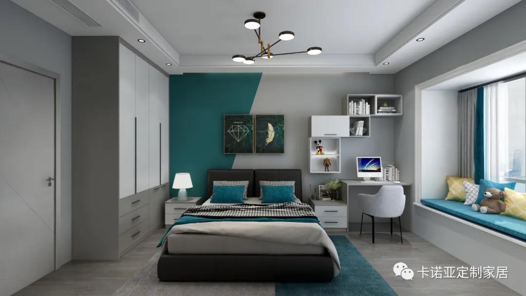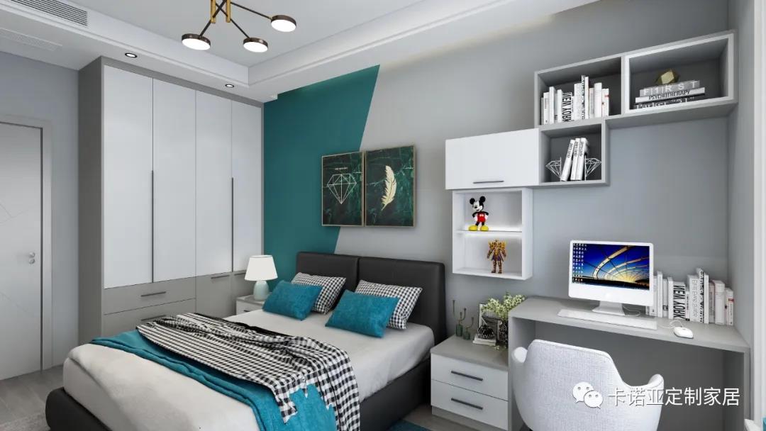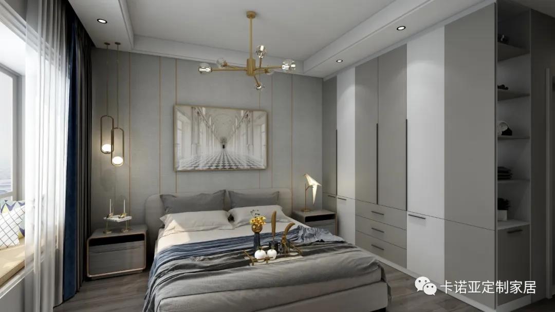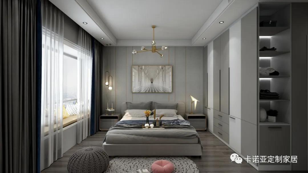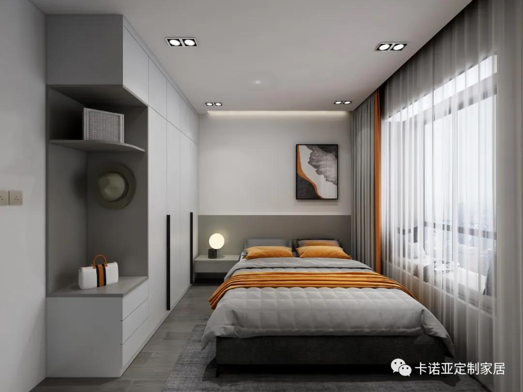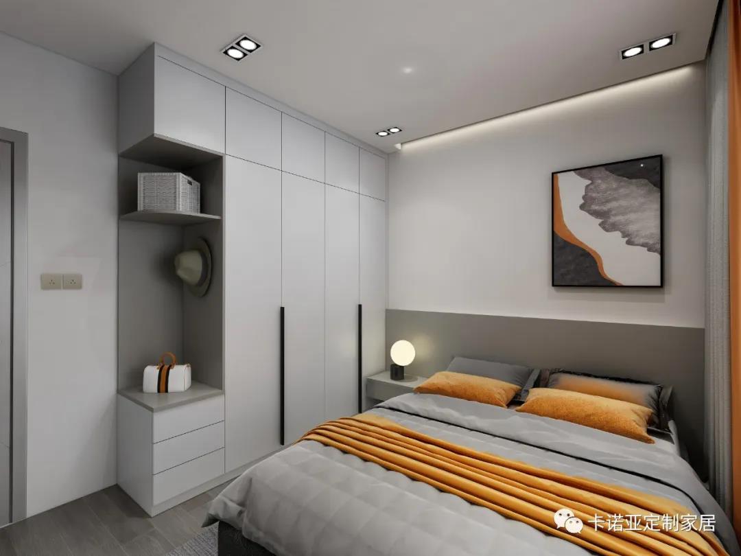 從干凈簡潔的主臥可以看出業(yè)主家居生活的審美與需求一柜到頂的L形雙拼色衣柜搭配長拉手,簡潔又實用還讓臥室在視覺和實際感官上都更為開敞