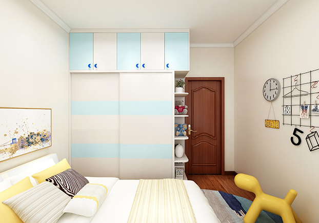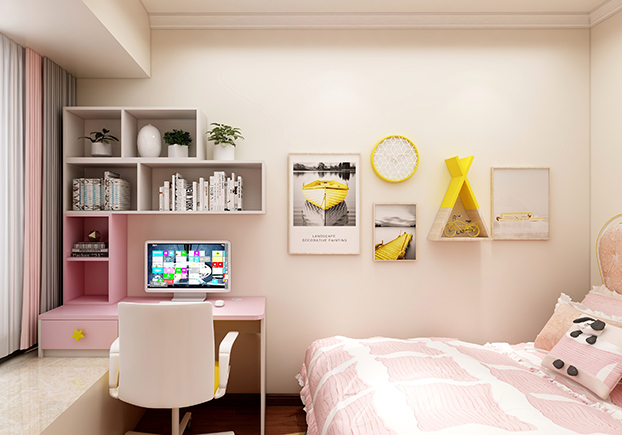 小朋友的房間比較明亮,童趣十足,水天藍和公主粉的設計再搭配明亮黃,瞬間輕快明亮,功課區(qū)和休閑區(qū)的設計,書桌功課做完立馬可以在休閑區(qū)玩耍,一房多用,小朋友們表示很喜歡自己的房間。