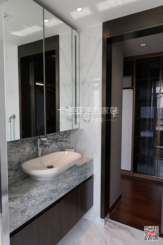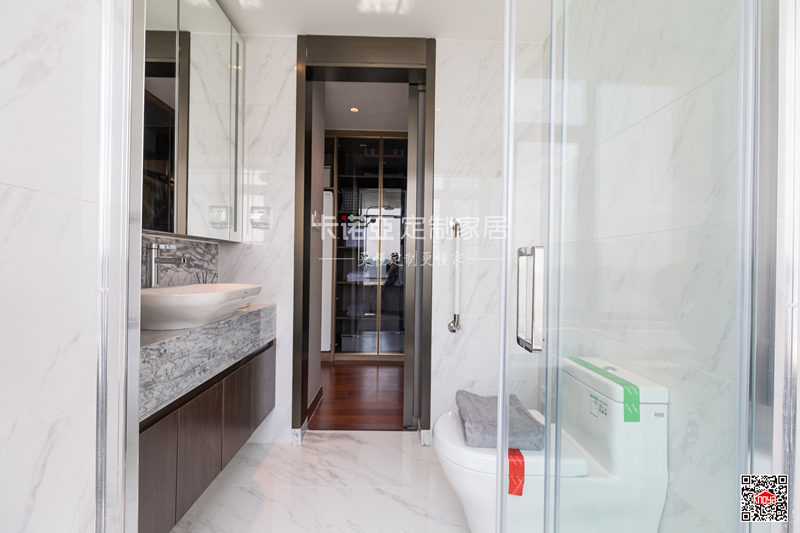 深色浴室柜體點(diǎn)睛,加上大面積玻璃的使用,衛(wèi)生間大氣明亮,空間通透開闊。