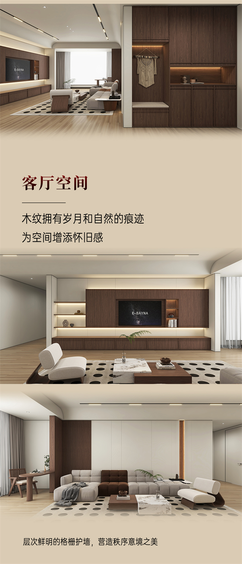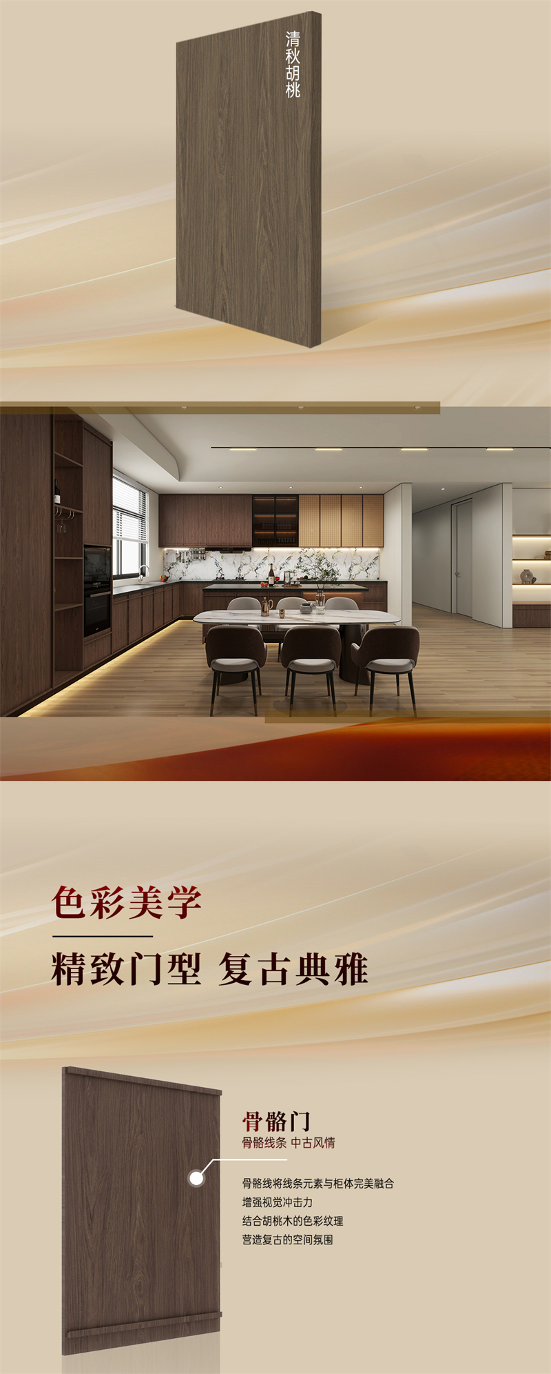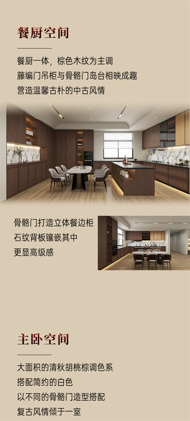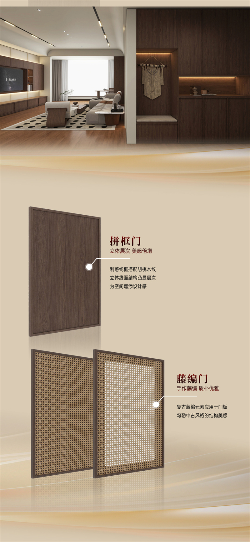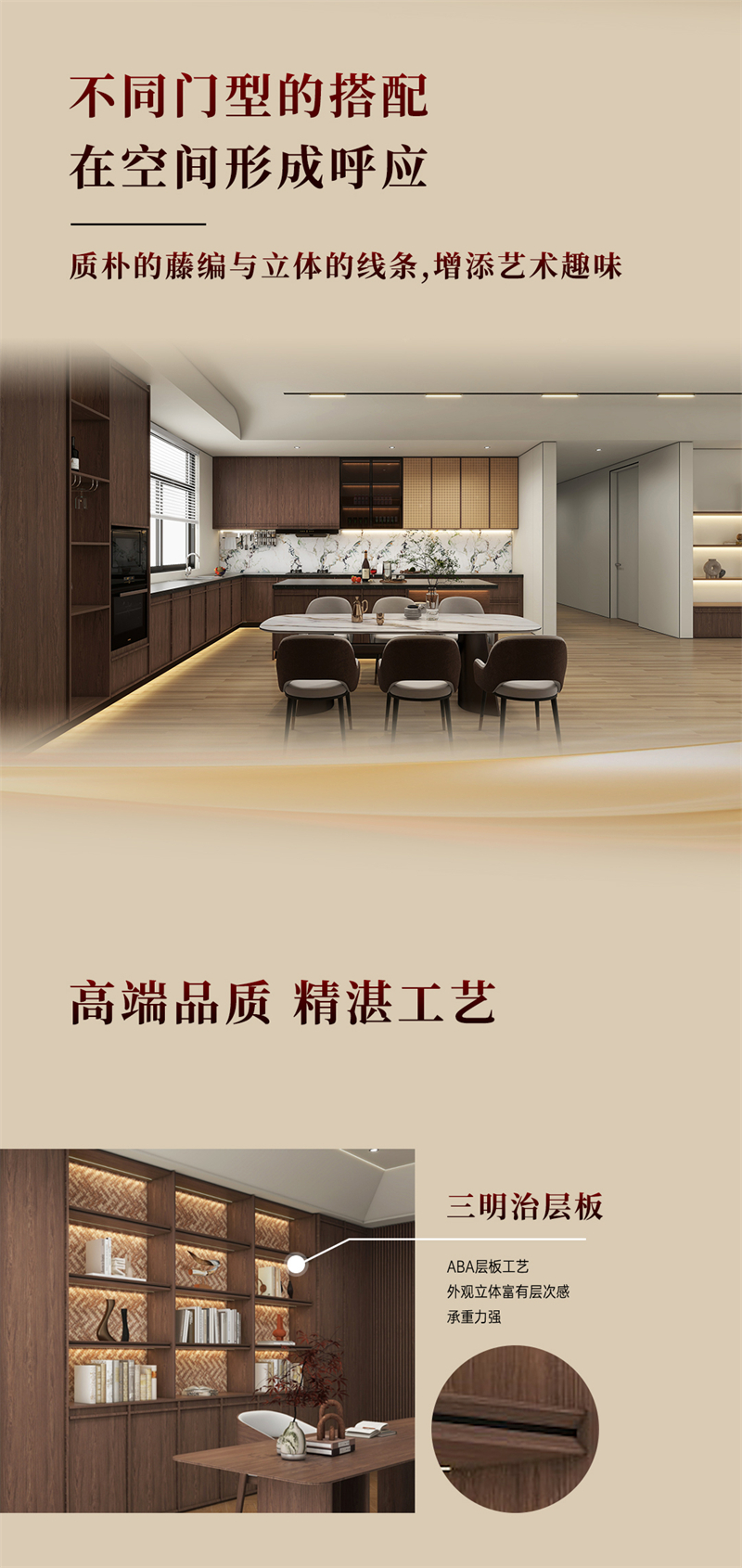 棕色胡桃木紋為主色調(diào),搭配白色暗紋,細膩的藤編門與硬朗的骨骼門讓人聯(lián)想到古老的家具,