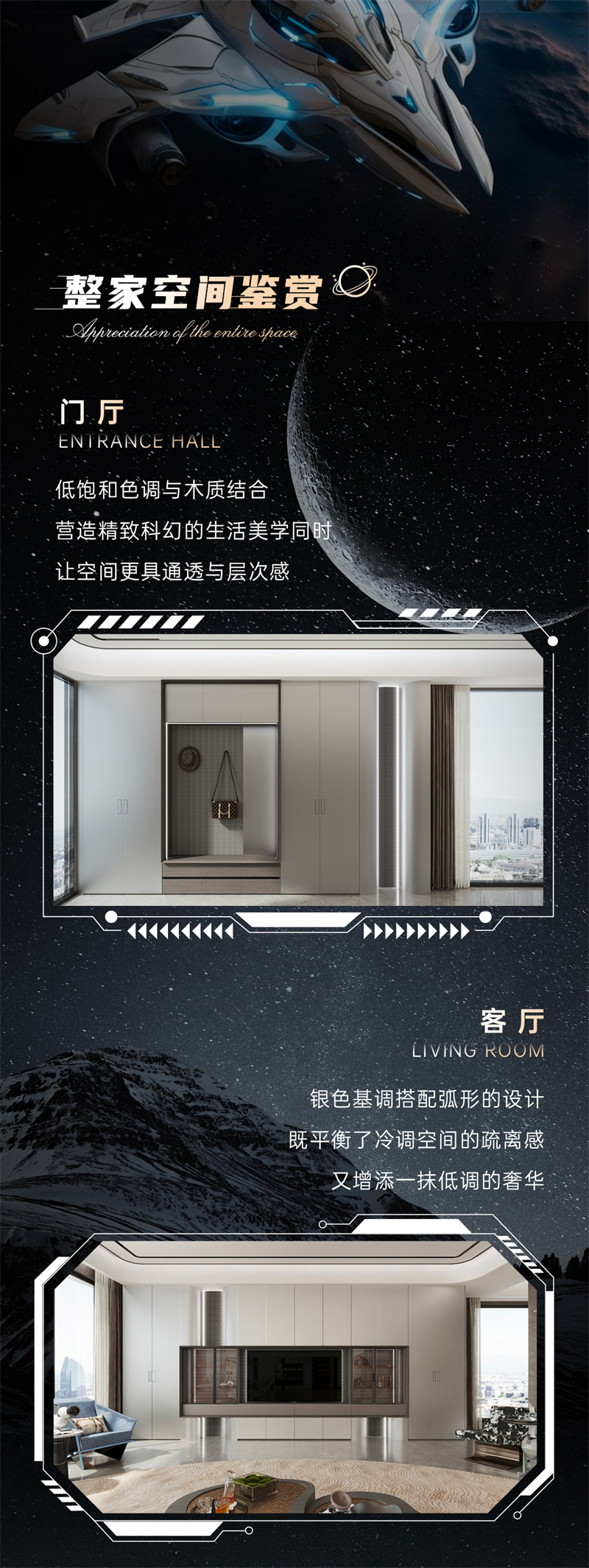 以科技青年(航天設(shè)計師、汽車工程師、科技創(chuàng)業(yè)者等)職業(yè)特性為核心,融入航天元素與汽車模型展示,借助流暢線條、科技燈光,搭配智能家居,營造未來感氛圍,滿足對科幻的遐想,實現(xiàn)科技與生活的融合,展現(xiàn)探索精神。