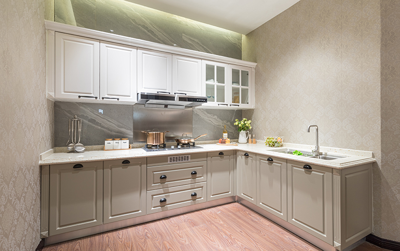 廚柜采用白色和淺灰色為主要配色,烘托空間的優(yōu)雅氣質。歐式淺色印花墻紙,與廚柜門板既相互融合,又能體現(xiàn)出層次間的落差美。