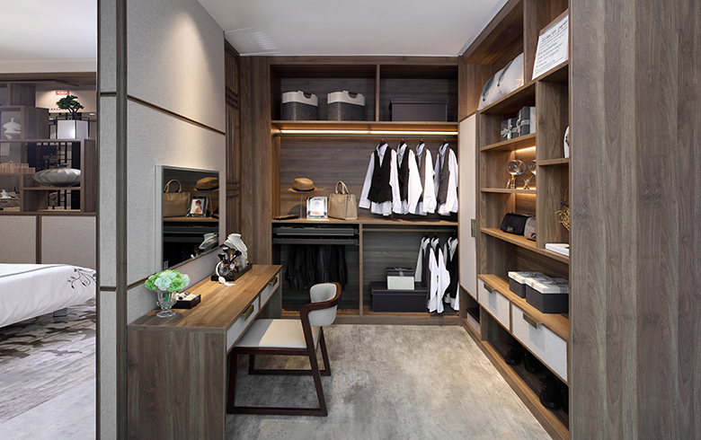 設(shè)計(jì)上順應(yīng)趨勢(shì),去掉多余的衣物掛放區(qū),增加擺放展示區(qū),凸顯衣帽間的實(shí)用功能。兼顧功能與美學(xué)的設(shè)計(jì)宗旨,實(shí)現(xiàn)書房、衣帽間、化妝間三合一功能空間。