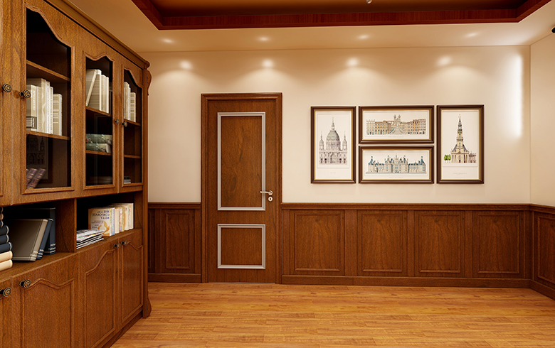 延續(xù)歐式墻裙式護墻板的傳統(tǒng),墻面胡桃木自由深刻年輪般的木紋靈動多變,自然雋永,帶給人一種復古典雅的別致美感體驗,成為整個房間裝修設計的亮點所在。墻裙式護墻系統(tǒng)與免漆門、書柜、木地板同色搭配,空間一體性極強,低調奢華,演繹新一代美式經(jīng)典的形態(tài)。
