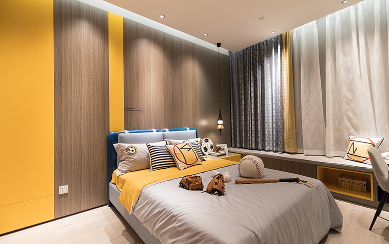 不同于普通的兒童房墻面采用油漆,本套空間的墻面加入了護(hù)墻板,除了營造簡潔明快的專屬兒童臥室特征之外,采用原木色與活力橙條紋相間的護(hù)墻板,清新健康,為整個空間增添了活力。