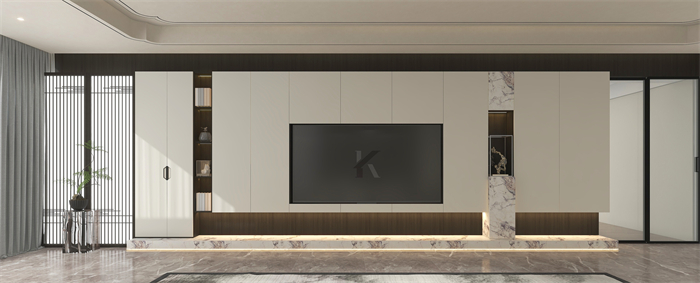 電視柜以環(huán)保水性漆“雅杏”淺色為主,構(gòu)筑素雅基調(diào),水墨石紋、古樸木紋、格柵屏風加持,濃濃的東方韻味。