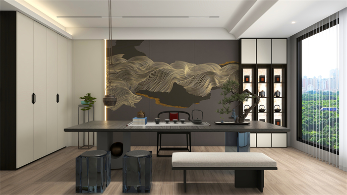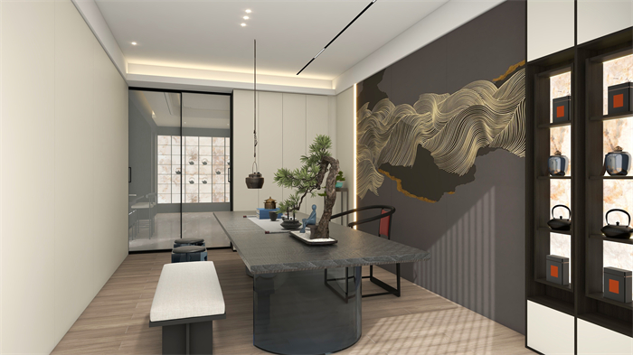 茶室:打破傳統(tǒng)對稱均衡,一側(cè)一門到頂封閉柜,一側(cè)半開放式設計,既彰顯東方韻味,又為視覺做減法,簡單大雅。玻璃的通透與木紋的肌理相互交融,剛?cè)嵯酀?,精致而高級?/span>