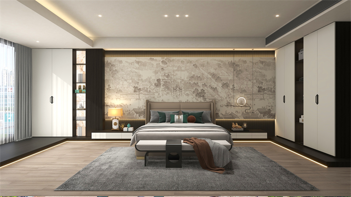 主臥:衣柜及床頭柜采用對稱式設計,與圓形燈裝飾掛件形成了方與圓的空間禮序,多處鏤空設計展示朦朧透視的詩意想象。床尾凳實用與顏值兼?zhèn)?,要穿的衣服可以放在這里,還可充當早餐椅,就著陽光,吃著早餐。深色U型地臺將淺色柜體抬起,收納與顏值兼?zhèn)洌?D錯落增加懸浮感,搭配古風市井畫,夢回千年古都。