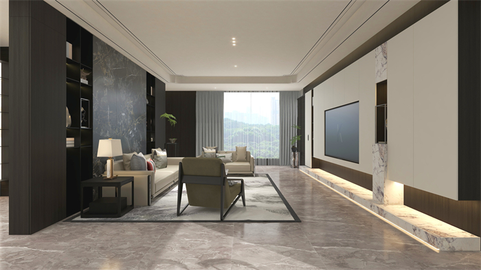 沙發(fā)背景啞黑鋁板柜對稱設計,與深色“沉香”完美契合,遇見東方禮序之美,木紋、石紋、鋁板,傳統(tǒng)與現(xiàn)代材質(zhì)碰撞彰顯層次感,搭配國風家品,更顯東方意境。