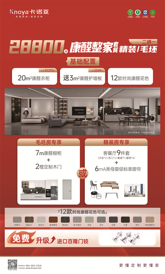 卡諾亞28800元康醛整家套餐,針對毛坯房精準推出20㎡康醛定制柜+3㎡康醛背景墻+7米康醛廚柜+2樘定制木門;針對精裝房精準推出20㎡康醛定制柜+3㎡康醛背景墻+全屋客餐廳9件套+6米A類母嬰級環(huán)保窗簾。本套餐定制柜及背景墻,均可選十余款康醛時尚花色,可免費升級進口百隆門鉸。