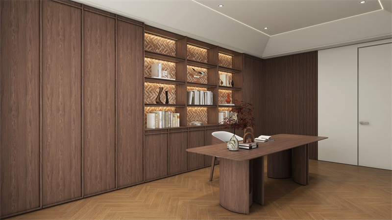 整墻書(shū)柜巧妙地運(yùn)用了骨骼門,凹凸有致的骨骼線,將線條元素與柜體柜門完美融合,增強(qiáng)視覺(jué)沖擊力。結(jié)合胡桃木的色彩紋理,營(yíng)造復(fù)古的空間氛圍,勾勒中古風(fēng)獨(dú)有的精致造型,彰顯別樣的藝術(shù)氣息。