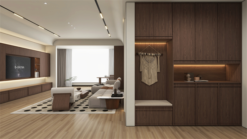 清秋胡桃與骨骼線搭配設(shè)計(jì),從入戶起就開(kāi)始鋪墊復(fù)古的基調(diào)。中間鏤空、換鞋凳的設(shè)計(jì),讓鞋柜實(shí)用性與裝飾性兼?zhèn)?,開(kāi)放區(qū)集掛、坐、置三重功能于一體。