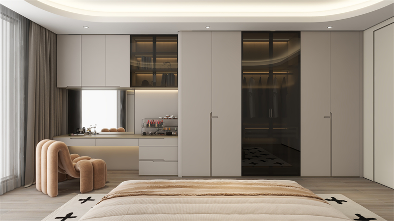 一門(mén)到頂衣柜,嵌入式梳妝臺(tái)一體化設(shè)計(jì)更省空間,在滿足衣物收納的同時(shí),亦解決日常美妝、辦公學(xué)習(xí)的需求。