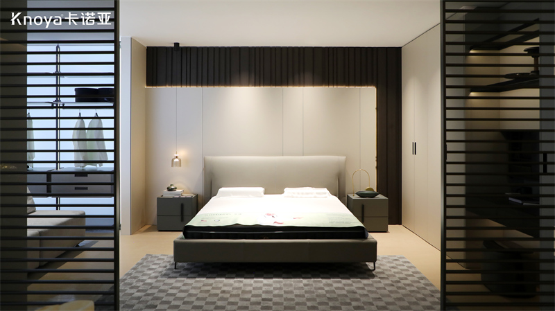 臥室空間,采用卡諾亞新品極簡風格覽境系列,以柜墻門一體化設計搭配更多功能系統(tǒng),打造符合生活偏好與美學的“臥室系統(tǒng)”,汲取臥室系統(tǒng)“閑忙享樂學”生活方式靈感。