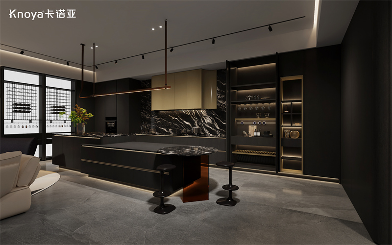 入戶、客廳、廚房空間,采用卡諾亞新品極簡風格木韻系列,黑色與金色的奢雅搭配,柔和的木紋肌理與線條營造濃郁的意式韻味。