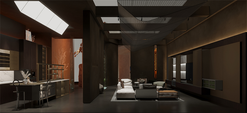 卡諾亞輕高定展館以洞穴為原型,通過天然巖石門廊、枯枝裝置藝術(shù)與層疊光影,營造神秘而治愈的探索場(chǎng)域。曲面墻體模擬地質(zhì)肌理,隱藏式燈光系統(tǒng)仿若天光傾瀉,參觀動(dòng)線暗合“發(fā)現(xiàn)-沉浸-共鳴”的情感邏輯。在這里,產(chǎn)品不再是孤立展品,而是與空間共生的美學(xué)符號(hào)、與生活方式的場(chǎng)景合拍,觀眾將在移步換景中感受“回歸自然,重塑空間”的品牌哲思。