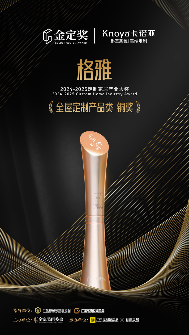 近日,金定獎2024-2025定制家居產(chǎn)業(yè)大獎頒獎典禮在廣州舉行。卡諾亞雅致輕奢風格格雅系列產(chǎn)品,以差異化高端工藝、天然珍稀材質(zhì)、原創(chuàng)設計語言和生活方式定制的設計邏輯,一舉獲得“金定獎全屋定制產(chǎn)品類·銅獎”,這不僅是中國家居產(chǎn)業(yè)對卡諾亞創(chuàng)新實力的一致認可,更是行業(yè)對卡諾亞深耕“臥室系統(tǒng)+整家定制”兩大品類的致敬。