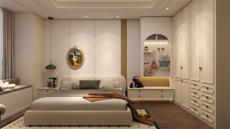 在這里,護墻板的柔和線條與懸浮式床頭柜的輕盈設計,為你打造出如詩般寧靜的休憩空間。整墻衣柜以香頌白為主色,搭配奶油色床品,讓晨起或睡前,每一眼都是治愈。