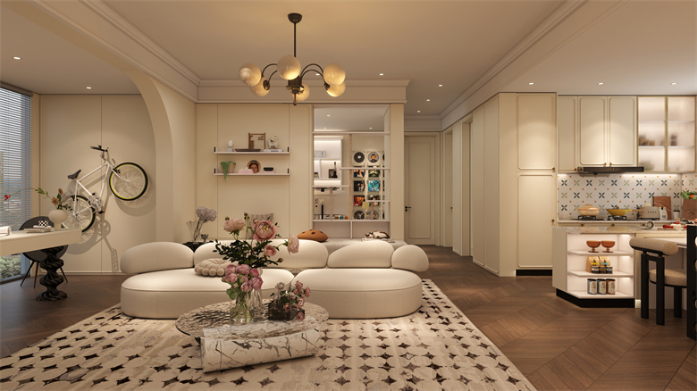 香草奶油主調營造出溫柔的空間基調,電視柜與餐邊柜采用香頌門型設計,通過吸塑工藝呈現(xiàn)優(yōu)雅流暢的曲線,為空間增添一抹靈動的韻律感。開放式布局巧妙串聯(lián)起家庭生活場景,在通透的空間中詮釋著法式家居的精致美學。