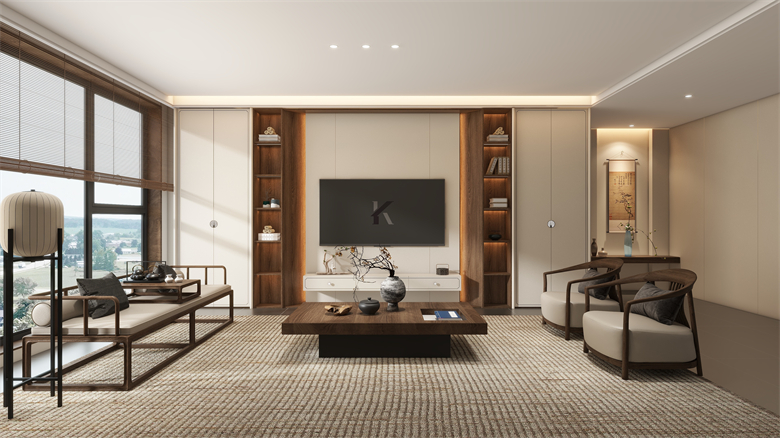 客廳作為家的核心,在林隱系列下盡顯新中式雅致。中式羅馬柱以簡潔線條傳承古韻,融入現(xiàn)代空間添層次美感。沙發(fā)背景墻3D打印山水畫卷,光影間似聞流水潺潺。懸浮電視柜輕盈,留白處藝術品點綴,空間在虛實中呼吸,盡顯精致內(nèi)斂。