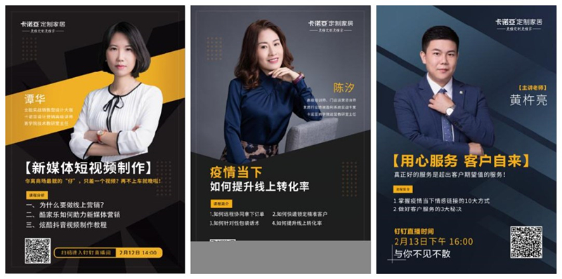2月初,卡諾亞全面啟動(dòng)線(xiàn)上辦公模式,通過(guò)釘釘App、微信直播、企業(yè)OA等部署和開(kāi)展工作。營(yíng)銷(xiāo)中心渠道部、招商部、商學(xué)院、大客戶(hù)部、軟裝事業(yè)部、市場(chǎng)部等部門(mén)線(xiàn)上工作統(tǒng)籌規(guī)劃啟動(dòng),其他各部門(mén)也在積極推動(dòng)線(xiàn)上工作進(jìn)程,以便積極響應(yīng)經(jīng)銷(xiāo)商的各種需求,商學(xué)院積極組織培訓(xùn)課程,讓經(jīng)銷(xiāo)商和員工充分利用好假期,為復(fù)工做好準(zhǔn)備。