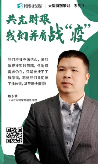 疫情之下,卡諾亞聯(lián)手家居行業(yè)上下游產(chǎn)業(yè)鏈各種資源,為中國(guó)家居提振信心助威吶喊,為戰(zhàn)勝疫情一起加油!卡諾亞定制家居副總經(jīng)理兼營(yíng)銷(xiāo)中心總經(jīng)理賴(lài)永精、營(yíng)銷(xiāo)中心副總經(jīng)理李偉明分別接受媒體采訪(fǎng),與多家媒體聯(lián)合發(fā)聲,和眾多家居企業(yè)一起并肩戰(zhàn)“疫”,呼吁同行積極思考、理性經(jīng)營(yíng),專(zhuān)注做好自己的事情,提高企業(yè)疫情危機(jī)下的免疫力和綜合競(jìng)爭(zhēng)力。