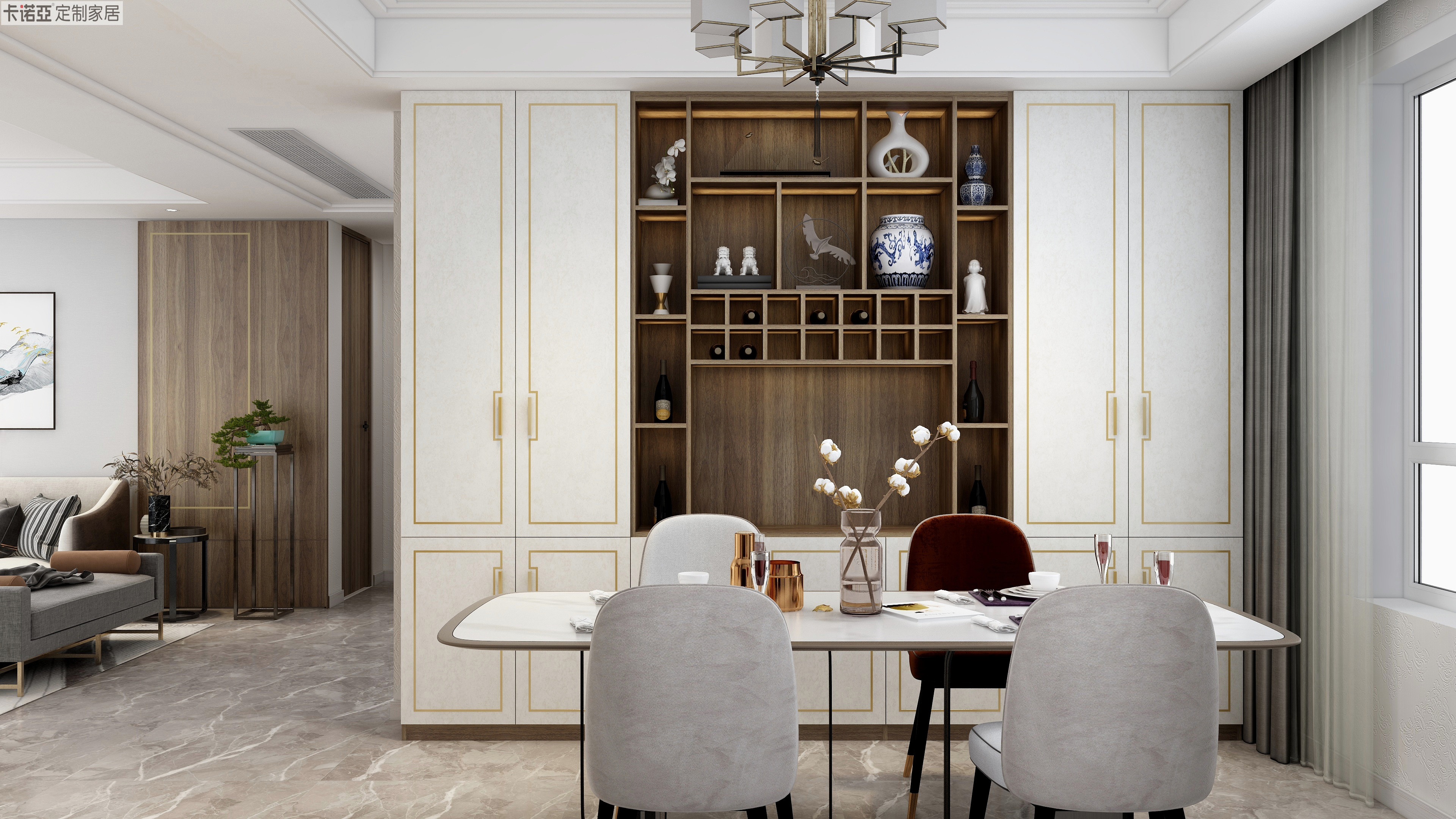 餐廳延續(xù)客廳風(fēng)格,餐邊柜采用左右對稱均衡的回紋型金屬條,在擴(kuò)大收納的同時(shí),顏值也大為提升。開放與封閉結(jié)合,讓空間多了一份呼吸感,中式宮燈映射下,讓就餐洋溢滿滿的儀式感。
