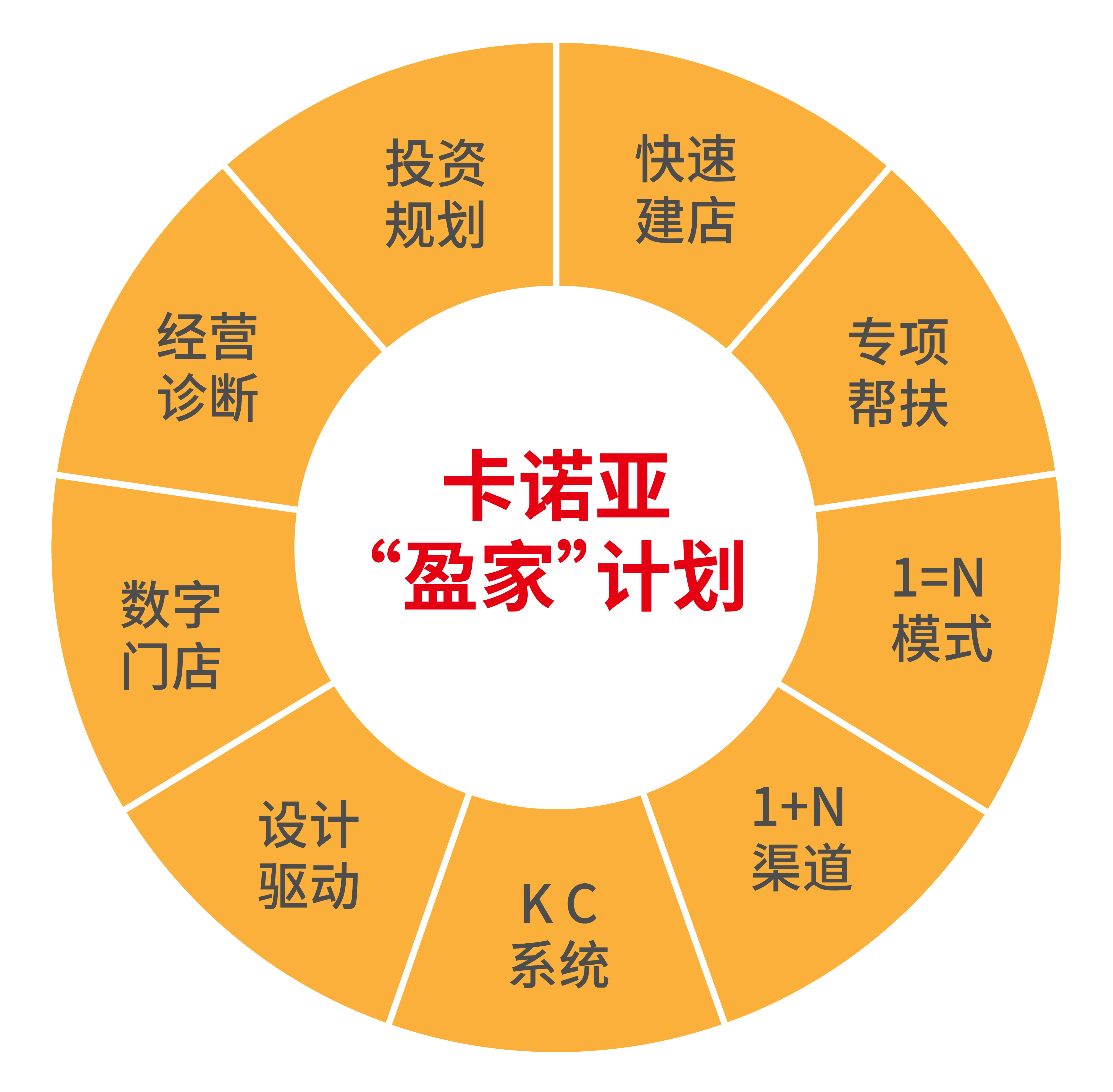 為了在全國范圍內(nèi)布局更大的市場,卡諾亞提供“盈家”計劃幫扶體系,全面賦能經(jīng)銷商,推出投資規(guī)劃、快速建店、專項幫扶、1=N模式、1+N渠道、KC系統(tǒng)、設(shè)計驅(qū)動、數(shù)字門店、經(jīng)營診斷等支持政策,從選址、裝修補貼到開業(yè)、運營管理,從全崗位培訓(xùn)到營銷活動策劃支持,卡諾亞提供一系列規(guī)范化的幫扶體系,貫穿經(jīng)銷商的整個成長過程,幫其快速掌握定制家居專賣店運營知識,實現(xiàn)快速上手、快速開店。