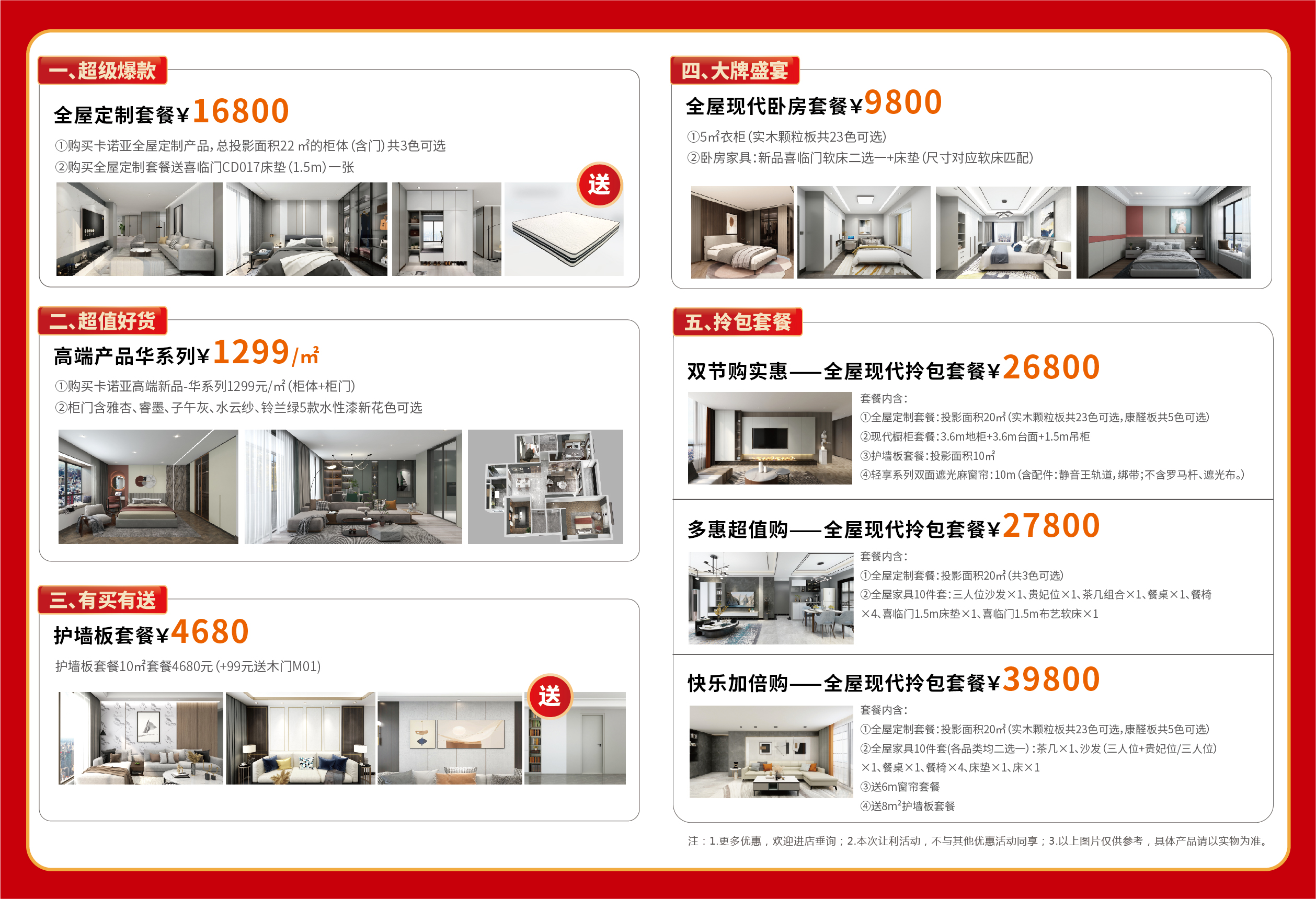 此次鉅惠,主要包括經(jīng)典全屋定制套餐¥16800,高端產(chǎn)品華系列¥1299/㎡,護(hù)墻板套餐¥4680,全屋現(xiàn)代臥房套餐¥9800,全屋現(xiàn)代拎包套餐¥26800、¥27800、¥39800,將優(yōu)惠進(jìn)行到底。