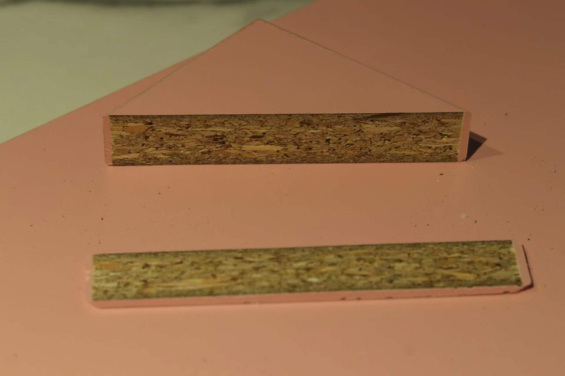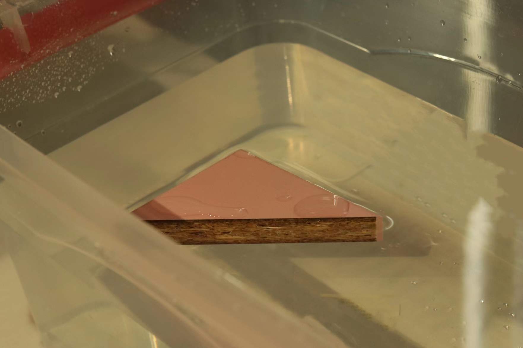為檢驗(yàn)板材防潮能力,小編將切割后的板材放入水中浸泡,幾個(gè)小時(shí)之后,將板材撈起發(fā)現(xiàn),看不出板材變形、膨脹,質(zhì)地依舊干燥且輕盈。這是因?yàn)榭等┌迨褂迷灸痉N顆粒,防潮性能強(qiáng),加上聚氨酯粘合劑(MDI膠)是制造密封劑和防水涂料的原料,所以防水防潮能力相當(dāng)出色,更加適用于廚房等潮濕的空間。