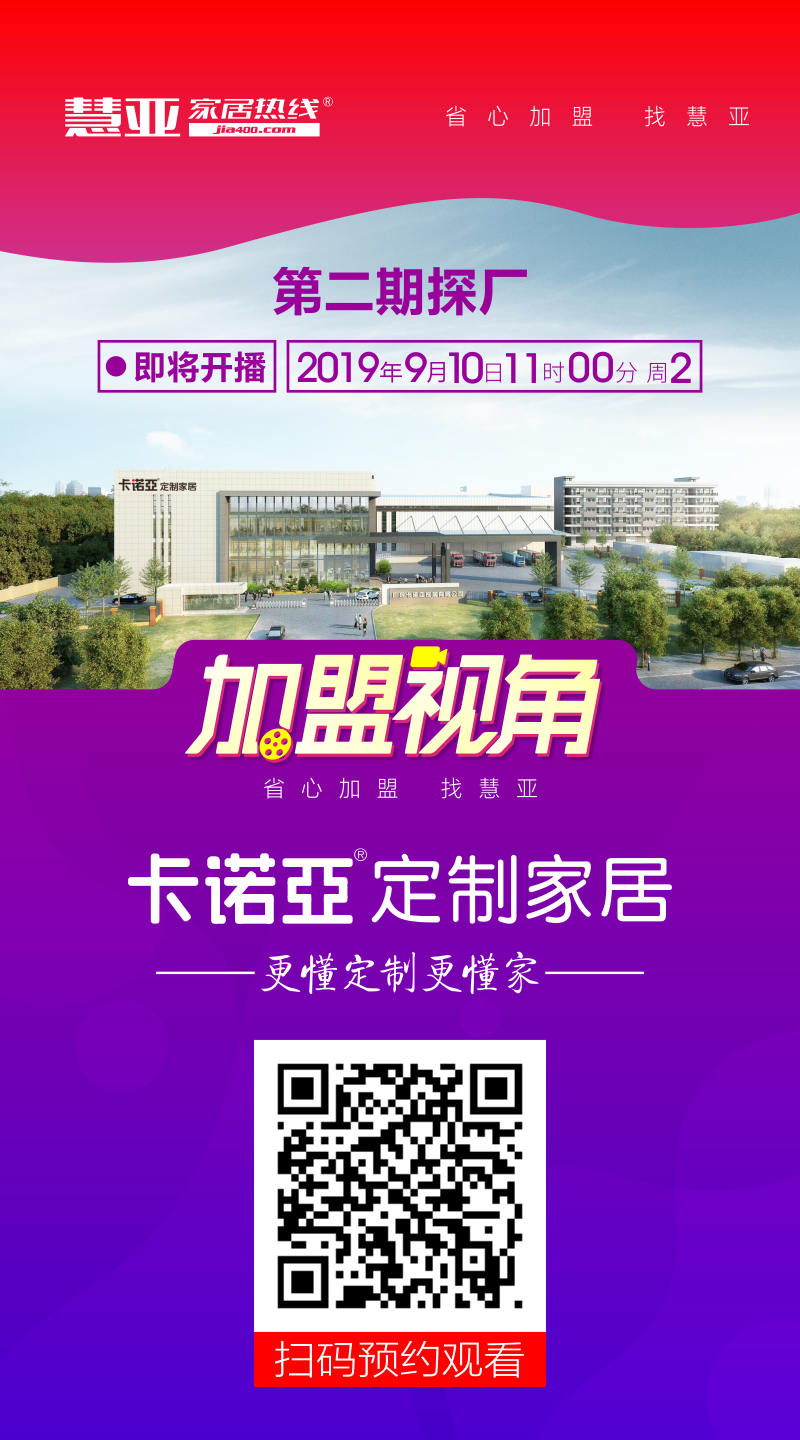 重磅信息?。?!9月10日慧亞家居熱線《加盟視角》將會正式開播,走進家居行業(yè)知名品牌卡諾亞,專業(yè)定制家居18年,全國1000+專賣店,20余萬㎡工業(yè)4.0智造基地,每年服務百萬家庭。本期節(jié)目將全方位揭曉卡諾亞是如何讓加盟商放心賺錢!