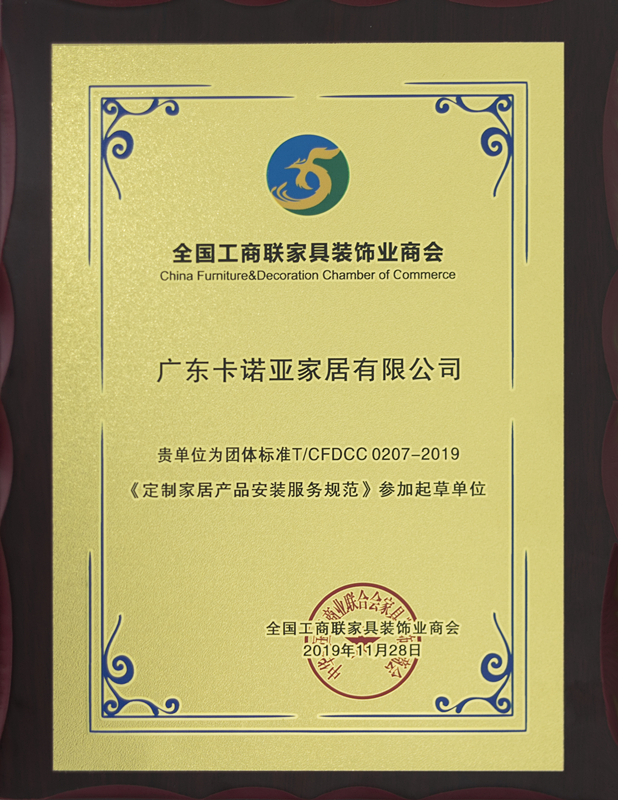 近日,中國全屋定制十大品牌之一的卡諾亞,獲得由全國工商聯(lián)家具裝飾業(yè)商會頒發(fā)的“中國家居業(yè)高質(zhì)量發(fā)展示范企業(yè)”,同時卡諾亞還成為團體標準T/CFDCC0207-2019《定制家居產(chǎn)品安裝服務規(guī)范》參加起草單位,這是對卡諾亞專注定制家居18年品牌實力的肯定與鼓勵。